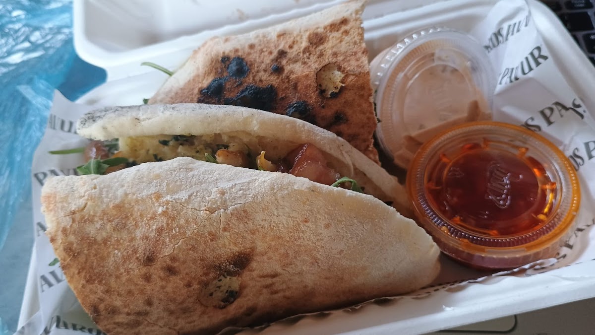 Pan de masa madre relleno de pollo a la plancha, tocino ahumado, cebolla y mix de quesos